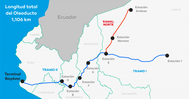 The North Branch made it feasible to transport the crude oil that is extracted from the oil fields of lot 192 (formerly lot 1AB). It begins its journey at Andoas Station and continues in a southwest direction, crossing the Pastaza, Huazaga and Huituyacu rivers, until the Morona river crossing. The pumping station of the same name is located there. Always in a southwesterly direction, it crosses the Marañón River and continues, through flat and dry terrain, until the crossing of the Saramiriza River, reaching Station 5 of the ONP on its final route.